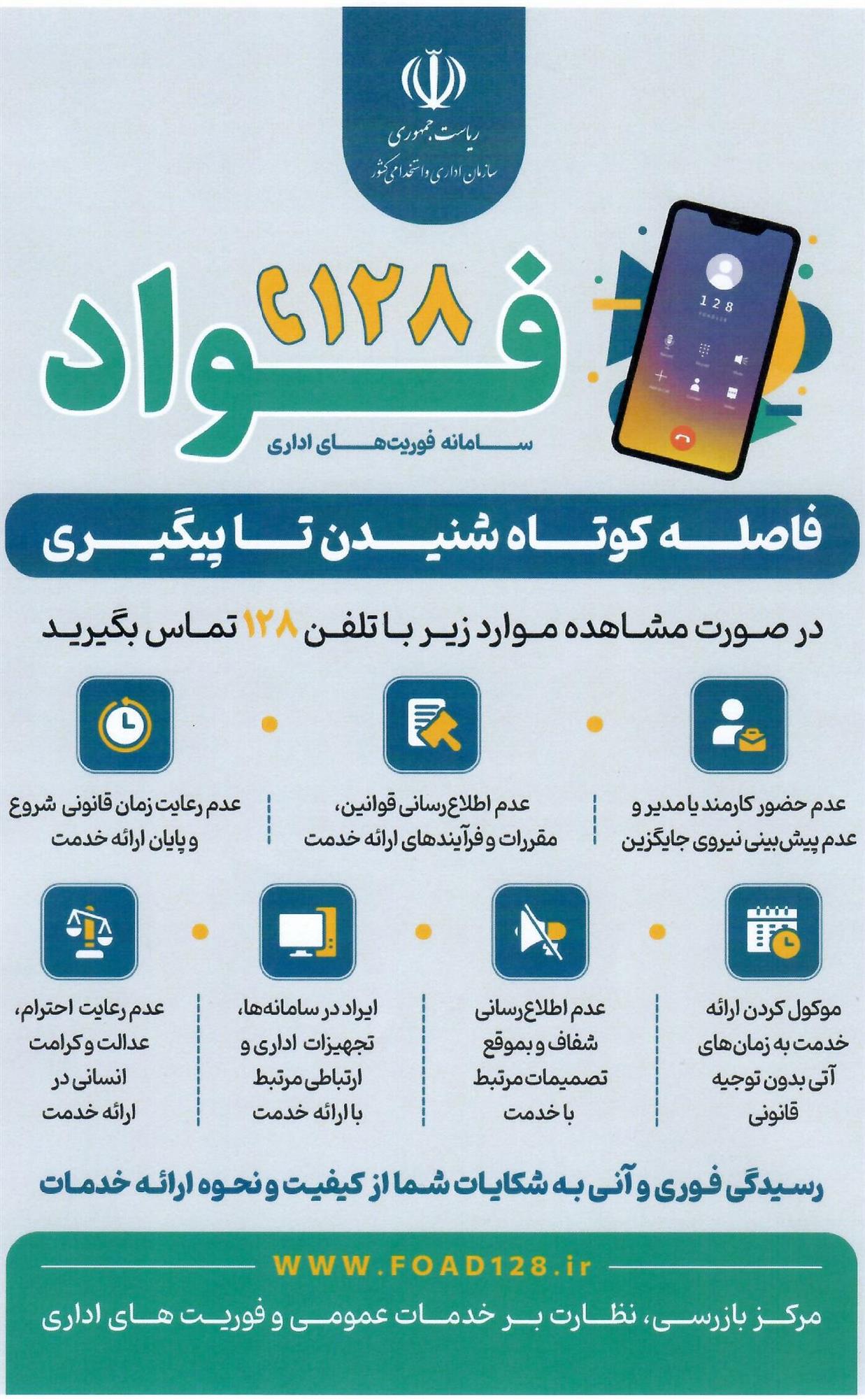 سامانه فواد ۱۲۸ یک سامانه ملی برای ثبت شکایت فوری از عملکرد نظام اداری است که پیگیری را تا پاسخ نهایی انجام می دهد.